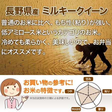 長野県産 ミルキークイーン。お弁当やおにぎりにピッタリ!冷凍後にレンチンしても美味しい人気のお米です。