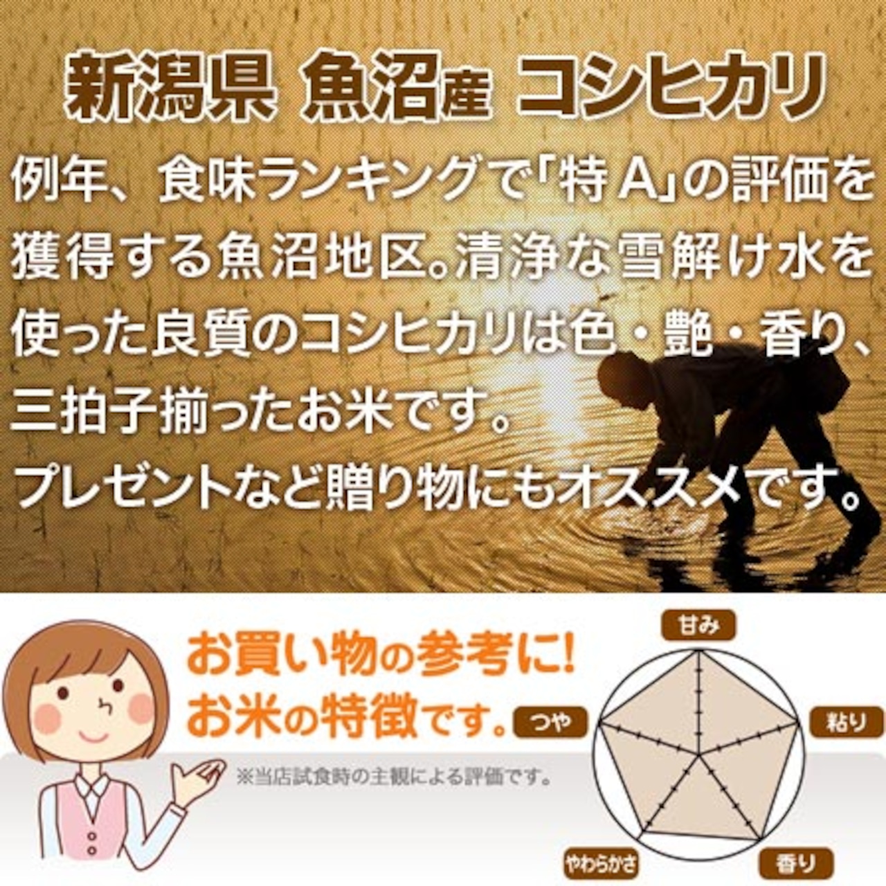 新潟県魚沼産こしひかり。良食味でプレゼント等の贈り物にも最適です。