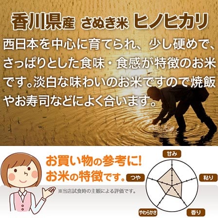 香川県産 ひのひかり。少し淡白な味わいのお米ですので、焼飯やお寿司などによく合います。
