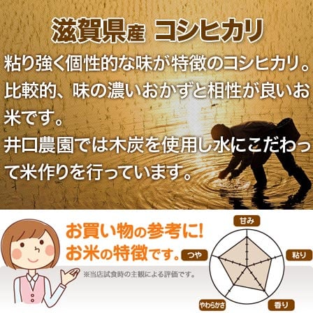 滋賀県 こしひかり。豊かな土壌と、きれいな水で育てられたこしひかりは、噛むほどに甘みを感じます。