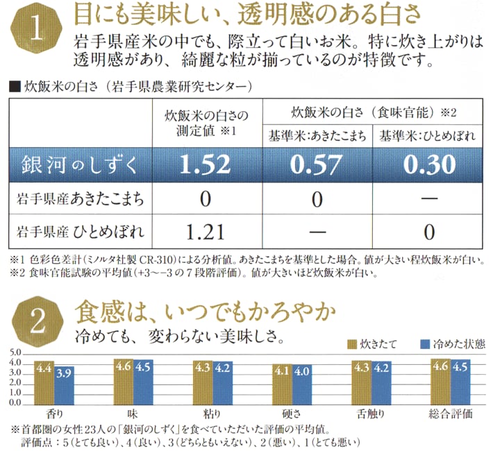 岩手県 銀河のしずく。口に含んだご飯にザラついた食感も無く、冷めたご飯も甘みとモチモチ感が十分に残ります。