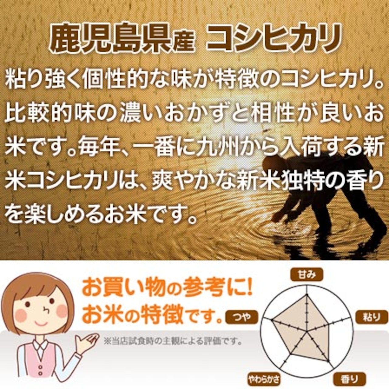 鹿児島県 コシヒカリ。粘り・甘み・香りも良好で、いち早く新米を食べてみたい方にオススメです。