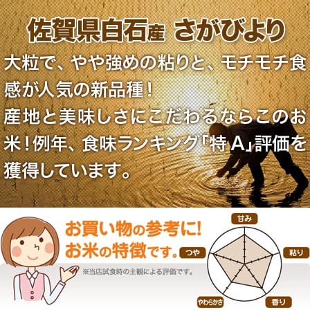 佐賀県 さがびより。生産者が手間ひまかけて育てたさがびよりは、大粒でつやのある外観が特徴で、食べ応えのある食感が味わえます。