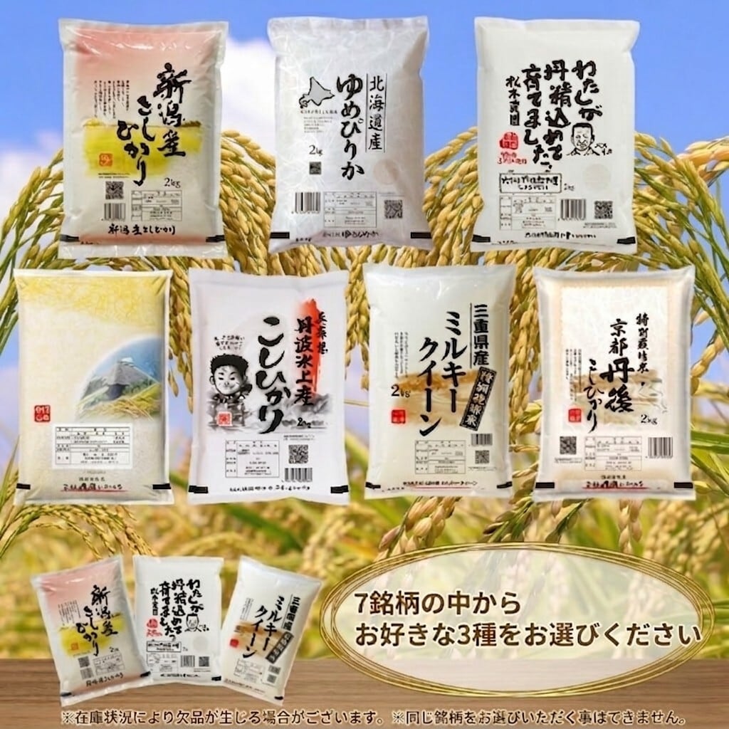 北海道 ゆめぴりか/新潟県 コシヒカリ/三重県 コシヒカリ/三重県 ミルキークイーン/京都府 丹後コシヒカリ/兵庫県 丹波コシヒカリ大分県 ひとめぼれ